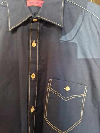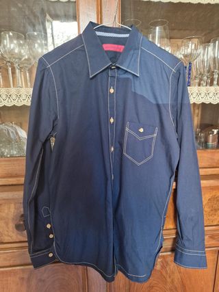 Camicia indossata solo x evento, blu con impunture e rifiniture senape con taschino sul davanti 3 bottoni sul polsino. Cotone 100%. Ampiezza spalle 40 cm / Lunghezza 68 cm