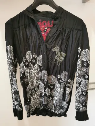 Camicetta a maniche lunghe con un design vivace e dettagli unici. - Fantasia floreale bianca e grigia. - Stampa di una zebra sul davanti. - Collo alto con bottoni. - Fondo elasticizzato. - Camicia nera taglia M.