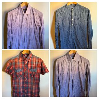 Lotto composto da quattro camicie da uomo usate: - Una camicia a maniche lunghe color lilla, marca Conbipel, veste come una M; - Una camicia a maniche lunghe effetto denim blu con colletto alla coreana, marca OVS, taglia S; - Una camicia a maniche corte a quadri rossi e blu, marca Grand&Hills, taglia S; - Una camicia a maniche lunghe color lilla, interno colletto con trama a quadretti, veste come una M.