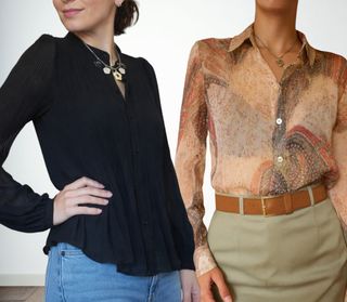 🌸 Camicia beige fantasia cashmere (vintage) Camicia effetto seta “vedo non vedo”, stile vintage, con fantasia cashmere nera e rossa. Elegante ma anche casual, si presta a molti abbinamenti (come mostrato in foto). Taglia unica – veste bene fino a tg 46 Tessuto sintetico con effetto seta Senza etichetta Condizioni: perfette 📏 Misure Spalle: 40 cm Lunghezza: 60 cm 🌸 Camicia nera ZARA plissettata Camicia ZARA originale, elegante e versatile, ideale per ufficio, aperitivi e serate. Può essere indossata anche come spolverino leggero. Taglia S Chiusura con bottoni Ottime condizioni Spedizione o consegna zona Porta di Roma