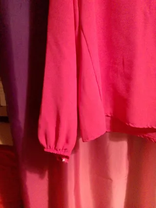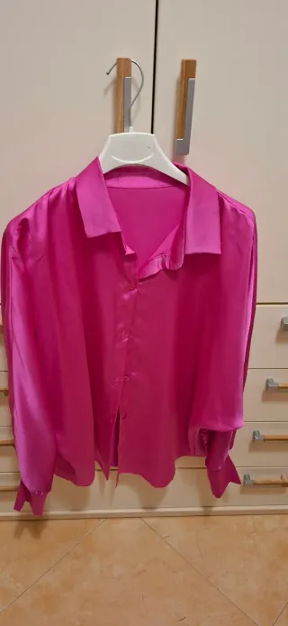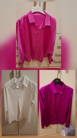 Set di tre camicie da donna, perfette per ogni occasione. - Tessuto lucido effetto seta. - Colore rosa magenta e bianco. - Taglia unica.