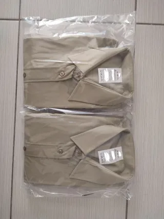 Due camicie da donna a maniche lunghe dell'Esercito, colore cachi. - Materiale resistente. - Chiusura con bottoni. - Colletto classico. Taglia scritta nell'etichetta. 2 pezzi, ancora imbustate