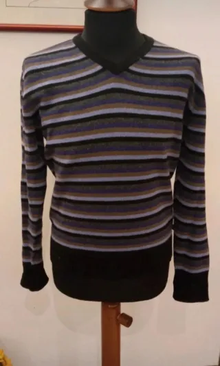 Maglione 7Camicie | Lana Vergine | Taglia M Splendido pullover 7Camicie con scollo a V, caratterizzato da un raffinato motivo a righe orizzontali nei toni del viola, nero e grigio. Un capo versatile, perfetto per un look casual-chic sopra una camicia o una t-shirt. Dettagli principali: Composizione: 80% Lana Vergine, 20% Nylon (caldo e morbido). Design: Bordi a costine su polsini e fondo per un'ottima vestibilità. Condizioni: Ottime, senza difetti. Misure (Taglia M): Spalle: 48 cm Lunghezza: 63 cm