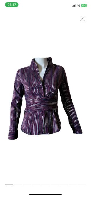 Elegante camicia Nara Camicie con un motivo a righe verticali. - Colore viola con righe - Design con cintura intrecciata. - Maniche lunghe. Camicia Nara Camicie - tessuto elasticizzato- larghezza spalle 38 cm - lunghezza manica 59 cm - larghezza petto 44 cm - lunghezza 63 cm