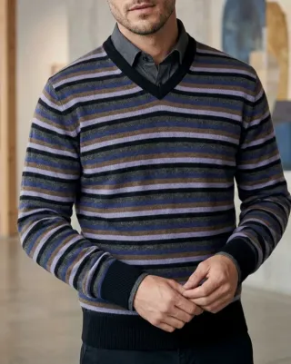 Pullover 7Camicie con scollo a V, caratterizzato da un raffinato motivo a righe orizzontali nei toni del viola, nero e grigio. Un capo versatile, perfetto per un look casual-chic sopra una camicia o una t-shirt. Dettagli principali: Composizione: 80% Lana Vergine, 20% Nylon (caldo e morbido). Design: Bordi a costine su polsini e fondo per un'ottima vestibilità. Condizioni: Ottime, senza difetti. Misure (Taglia M): Spalle: 48 cm Lunghezza: 63 cm 💫Ho incluso un'immagine dimostrativa per mostrare come calza il capo una volta indossato