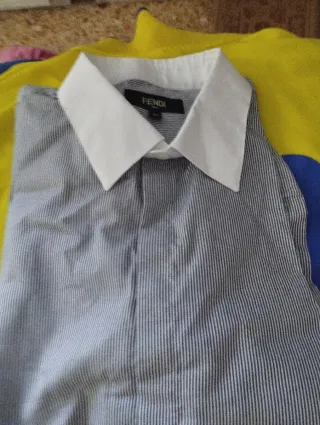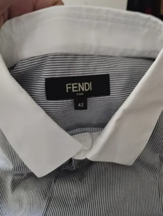Camicia Fendi con un elegante motivo a righe grigio e nero. Il colletto e i polsini sono bianchi, creando un contrasto classico.apoena presa dalla tintoria - Motivo a righe. - Colletto e polsini bianchi.
