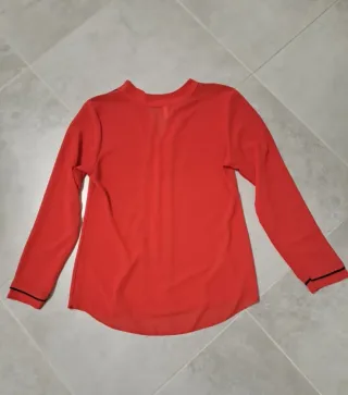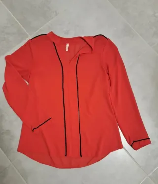 Elegante camicia da donna, perfetta per ogni occasione. Il design moderno la rende un capo versatile. - Scollo a V con dettagli a contrasto. - Maniche lunghe. - Tessuto leggero e confortevole. Bellissima blusa a maniche lunghe, colore rosso vivo. Perfetta per ogni occasione! Maglia manica lunga, tipo camicia, con colletto alla coreana e con inserti sulle spalle, polsini e nella parte anteriore. Lunghezza 63cm, larghezza spalle 40 cm e larghezza seno 43 cm. Taglia italiana/UE 42.