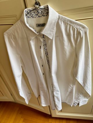 Camicia da donna a maniche lunghe,in cotone tipo Oxford - Colletto classico. - Fantasia floreale blu all'interno del colletto e sulla patta. - Bottoni blu. - Misure visibili in foto.