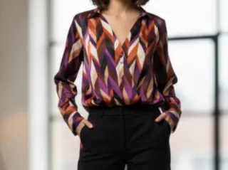 VICOLO – Camicia Fantasia Geometrica Multicolore – Taglia M In vendita bellissima camicia firmata VICOLO, caratterizzata da una vivace stampa geometrica a zigzag nei toni del viola, ruggine, nero e panna. Il tessuto ha un finish satinato che dona una splendida lucentezza al capo. Il design è moderno e versatile: presenta un profondo scollo a V incrociato sul davanti, chiusura con bottoncino centrale e polsini alti con bottone gioiello viola. Il taglio è high-low (più corto davanti e lungo dietro), perfetto da indossare con pantaloni o gonne a vita alta grazie al bordo elasticizzato sul davanti. Dettagli del Capo: Marca: VICOLO