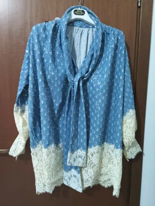 Camicione da donna in stile jeans, con dettagli scintillanti e inserti in pizzo. - Maniche lunghe. - Scollo con fiocco. - Fondo e maniche con pizzo.