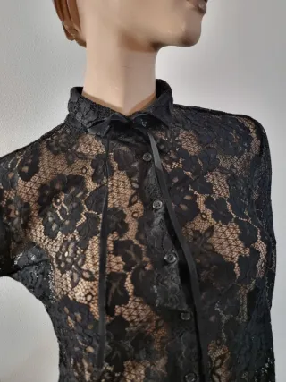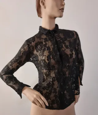 Elegante camicia in pizzo nero, perfetta per un look sofisticato. - Tessuto in pizzo floreale. - Leggermente sfiancata - Chiusura con bottoni. - Maniche lunghe. - Misure in foto, veste circa xs