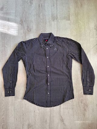 Camicia blu a quadretti bianchi. Taglio sciancrato Collo button down 100% Cotone In perfetto stato. Non presenta alcun segno di usura, neanche su collo e polsini. Vendo perché troppo piccola per me.