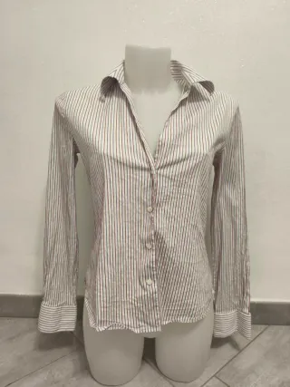 Camicia a maniche corte con dettagli a balze sul davanti. Presenta una fantasia a righe. Taglia IV. Indossata un paio di volte - Fantasia a righe verticali. - Collo con balze. - Chiusura con bottoni.