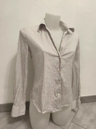 Camicia a manica tre quarti con un design a righe verticali. Taglia IV. Indossata un paio di volte - Colletto a balze. - Chiusura con bottoni. - Tessuto leggero.