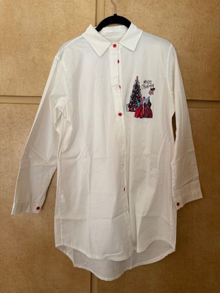 Maxi camicia bianca a maniche lunghe, perfetta per il periodo natalizio. Presenta un'adorabile stampa a tema con un albero di Natale e la scritta Merry Christmas. I bottoni rossi aggiungono un tocco di colore vivace. - Maxi camicia bianca - Stampa natalizia con albero e scritta - Bottoni rossi