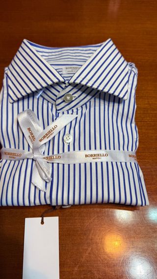 Bellissima e chicchissima camicia sartoriale di Borriello Napoli in puro cotone bianca e azzurra a righe la e taglia 41 pari a 15 e 16 di collo nuova come sempre le scarto le stirata e poi le metto nell’armadio con collo alla francese bottone in madreperla piatto e polsini arrotondati la camicia non presenta nessun segno di usura o difetti essendo nuova le misure sono collo 15 e 3/4 spalle 44 cm torace 55 cm lunghezza maniche 65 cm Camicia di grande qualità cucita a mano punti visibili in foto