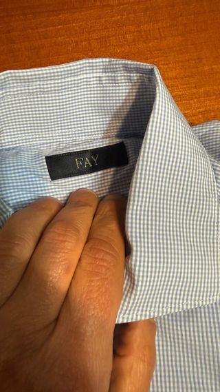 Bellissima e chicchissima camicia di FAY in cotone strach bianca e celeste a micro quadro la e taglia 41 pari a 15 e 16 di collo nuova come sempre le scarto e la stiro e poi le metto nell’armadio con collo alla francese bottone in madreperla pence posteriori e polsini arrotondati la camicia non presenta nessun segno di usura o difetti essendo nuova le misure sono collo 15 e 3/4 spalle 44 cm torace 54 cm lunghezza maniche 65 cm camicia bellissima