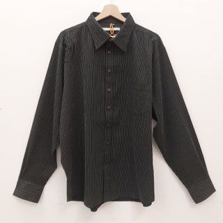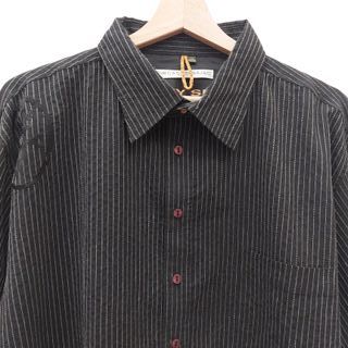 Camicia nera gessata con righe bianche di JC de Castelbajac. Bottoni rossi e monogramma ricamato sul fronte. Capo vintage autentico, raro e in ottime condizioni. Taglia 3XL molto stretta, è adatta anche ad una L/XL. Larghezza spalle: 50 Larghezza torace: 64 Lunghezza maniche: 69 Lunghezza totale: 80 Materiale esterno: 75% cotone - 25% poliestere Fodera: 100% viscosa