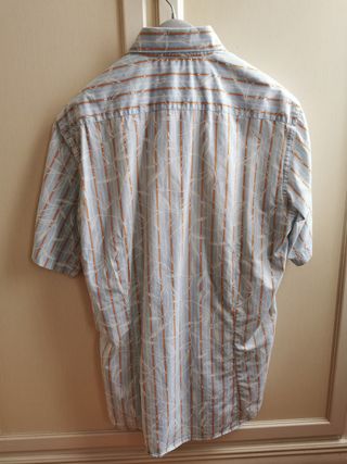 Camicia uomo a manica corta. In puro cotone. Base azzurro delicato con fantasia di foglie bianche e righette arancioni. Taschino sul lato sinistro. Taglia L. Marca: Jan Paulsen. Se siete interessati a più articoli, posso fare un set. Per info contattatemi.