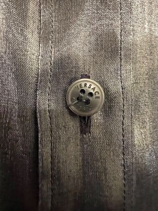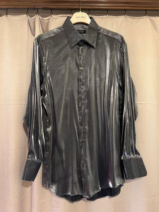 Elegante camicia Versace dal design unico e scintillante. - Tessuto lucido effetto metallizzato. - Colore argento brillante. - Vestibilità comoda e moderna. - misura ascelle 53, spalle 45, lunga 82