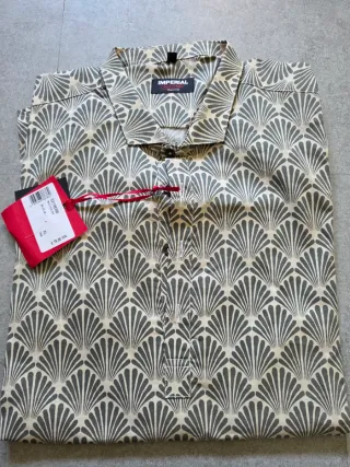Camicia da uomo Imperial con una fantasia geometrica.nuiva con cartellino taglia XL Lunghezza 78 cm Ascella ascella 58 cm Spalle 45 xm - Fantasia a ventagli beige e grigio. - Chiusura con bottoni. - Colletto classico.