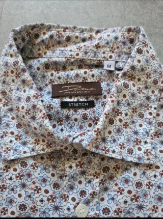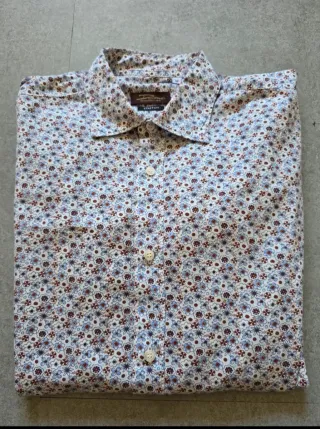 Camicia da uomo con una fantasia floreale all-over. Il tessuto è leggero e confortevole. Camicia da uomo taglia M Strech usata in buone condizioni. Lunghezza 73 cm Spalle 43 cm Ascella ascella 54 cm - Fantasia con fiori blu e marroni su fondo bianco. - Taglia M.