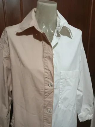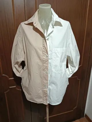 Camicia bicolore beige e bianca con tasche laterali e taschino sul petto, tessuto in cotone 100%. Taglia XS oversize. Spalle cm 40. Ascelle cm 50. Lunghezza cm 75.
