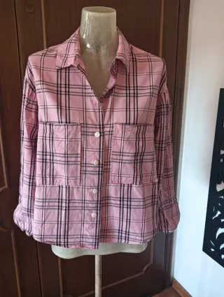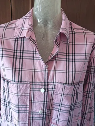 Camicia rosa e nera. Taglia XS oversize. Spalle cm 43. Ascelle cm 47. Lunghezza cm 65.