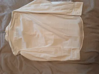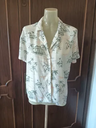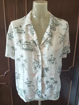 Camicia bianca con fantasia esotica, morbido tessuto in viscosa. Taglia S. Spalle cm 40. Ascelle cm 45. Lunghezza cm 55.