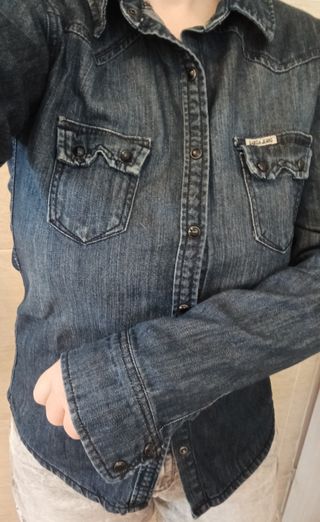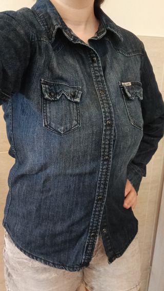 Camicia in denim del marchio Celio, taglia L (42-44 / 52-54) di colore blu, chiusura con bottoni automatici, maniche lunghe. Spalle cm 45. Ascelle cm 55. Vita cm 54. Fianchi cm 57. Lunghezza cm 75. Colletto interno un po' scolorito come ultima foto.