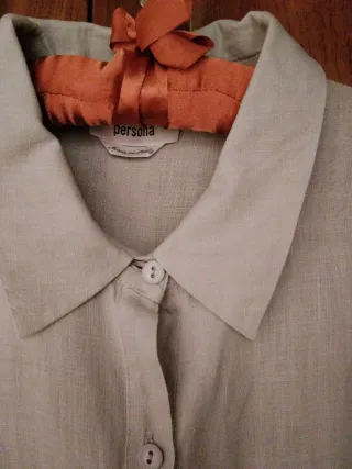 Camicia beige chiaro in cotone e lino, maniche lunghe regolabili con cinturino, taschino sul petto con dettaglio in azzurro, colletto alla coreana. Taglia L. Spalle cm 45. Ascelle cm 50. Lunghezza cm 75. - Tessuto misto lino e cotone. - Chiusura con bottoni. - Taschino sul petto con dettaglio azzurro.