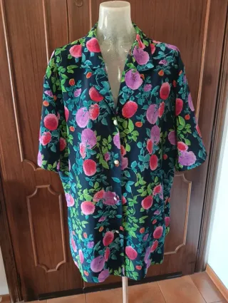 Camicia blu scuro con vivace fantasia floreale, maniche corte, bottoni dorati con perle, leggero tessuto fluido e fresco. Taglia XXL. Spalle cm 50. Ascelle cm 60. Lunghezza cm 75. - Scollo a V con colletto. - Chiusura con bottoni gioiello. - Tessuto leggero e confortevole.