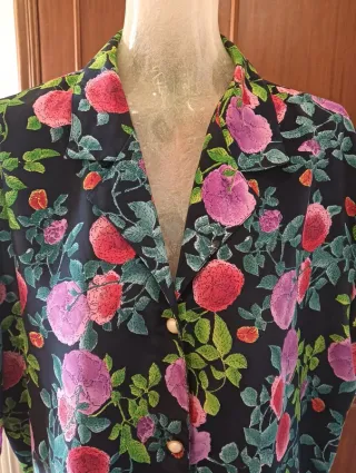 Camicia a maniche lunghe con una delicata fantasia floreale. Il tessuto è leggero e confortevole. Taglia XS. Spalle cm 37. Ascelle cm 40. Lunghezza cm 65. - Fantasia con fiori gialli e blu su fondo marrone. - Colletto classico. - Chiusura con bottoni.