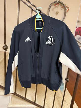 Giacca sportiva Adidas da donna, un capo versatile e alla moda. - Design bicolore con pannelli bianchi. - Logo Adidas sul petto. - Patch A sul lato sinistro. - Zip frontale. - Tasche con zip. - Collo e polsini a costine.