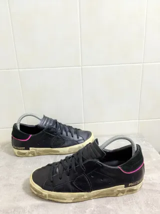 Sneakers Philippe Model da donna. - Tomaia in pelle nera. - Dettagli rosa. - Suola in gomma effetto vissuto. Attenzione 📢❗❗❗ I difetti sono visibili nelle ultime foto! Una volta indossati , alcuni di questi difetti sono invisibili! ✅