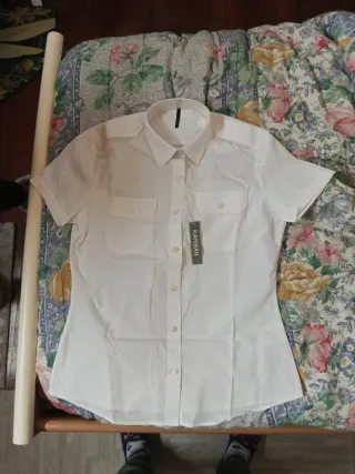 Camicia da donna a maniche corte, un capo versatile e classico. - Tessuto leggero e traspirante. - Due tasche sul petto con patta. - Chiusura con bottoni. - Dettagli sulle spalle con passanti.