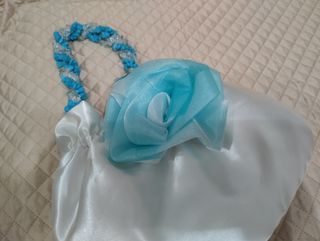 Pochette elegantissima in raso e rosa in chiffon. Manico in perline di pietre dure e vetri. Usata una sola volta. Nuova e pulita.
