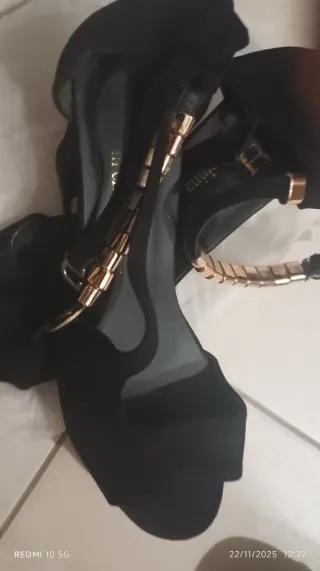 Eleganti sandali neri con un dettaglio a bracciale dorato. - Materiale effetto scamosciato. - Cinturino alla caviglia con chiusura a fibbia. - Dettaglio dorato a forma di serpente sul collo del piede.