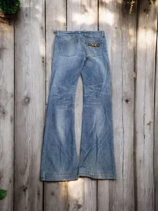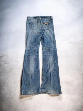 Jeans 70's vintage a zampa d'elefante con iconico dettaglio horsebit. - Modello flare. - Dettaglio horsebit color cuoio sul retro. - Tasche posteriori. - Denim lavato.
