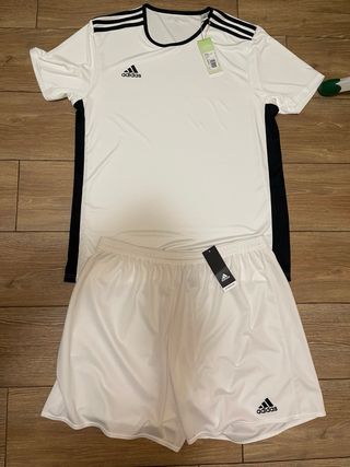 Set originale Adidas composto da maglia e pantaloncini. - Maglia a maniche corte con dettagli neri. - Pantaloncini con elastico in vita. taglia maglietta: XL taglia pantaloncini: 2XL