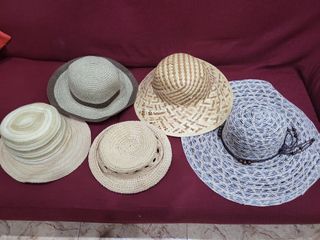 Set di cinque cappelli da donna, perfetti per proteggersi dal sole con stile. Design vari in materiali naturali. Tonalità neutre che si combinano facilmente. Stili a tesa larga e media. Lote completo 10€. Cappello singolo 2,5€.