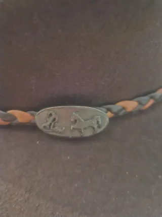 Sombrero da donna con un design unico e dettagli intrecciati. - Adorazione metallica con figura di cavaliere e cavallo. - Fascia intrecciata nei toni del marrone e del nero.