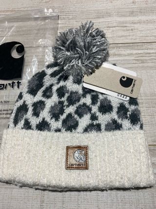 Berretto in maglia con stampa leopardata e pompon. Design con base bianca e stampa in grigio. Orlo a coste in bianco. Patch in pelle con logo nella parte anteriore.