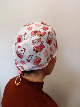 Cuffietta chirurgica con un simpatico pattern di gatti Maneki Neko e fiori di ciliegio. - Design con gatti portafortuna. - Motivo floreale. - Chiusura con cordino regolabile.