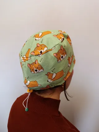 Cuffietta chirurgica da donna con una simpatica stampa di corgi addormentati su sfondo verde chiaro. Un accessorio divertente e pratico. - Stampa all-over di corgi. - Tessuto leggero e traspirante.