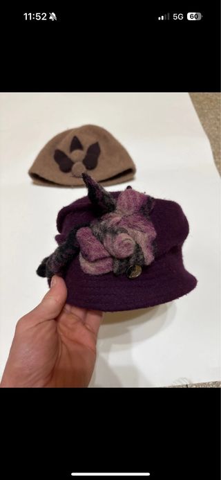 Due cappelli da donna, uno marrone e uno viola, entrambi con decorazioni. - Cappello marrone con fiocchi scuri. - Cappello viola con applicazione floreale e bottone.