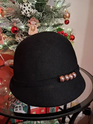 Elegante cappello da donna in panno nero diametro cm. 58. Nessun difetto - Dettaglio decorativo rotondo con finitura perla e bordo dorato.