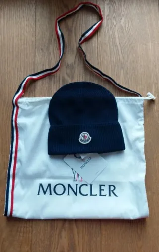 Set composto da cappello e sacca Moncler. - Cappello in maglia blu con logo. - Sacca in tessuto bianco con logo e laccetti. - Laccetti con strisce tricolore.