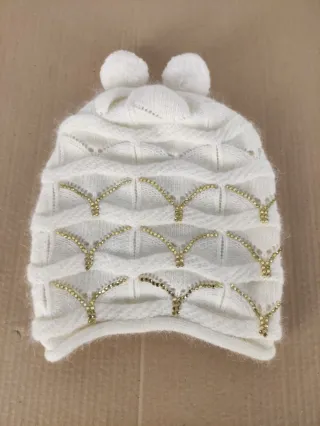 Morbido berretto da donna in lana d'angora, perfetto per le giornate più fredde. Il design è arricchito da dettagli luminosi. -Tagli unica donna. - Materiale: misto lana d'angora - Colore: bianco - Decorazioni: perle dorate. - Dettagli: pompon sulla sommità