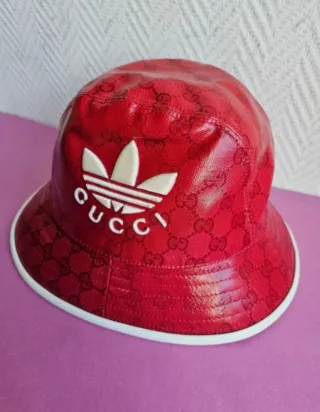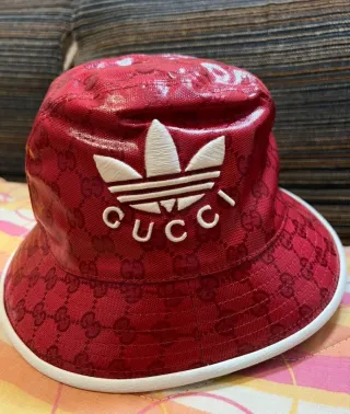 Cappello bucket in collaborazione tra Gucci e Adidas. Un accessorio di tendenza che unisce due marchi iconici. - Colore rosso vivace. - Fantasia monogramma all-over. - Logo Adidas e scritta Gucci sul davanti.